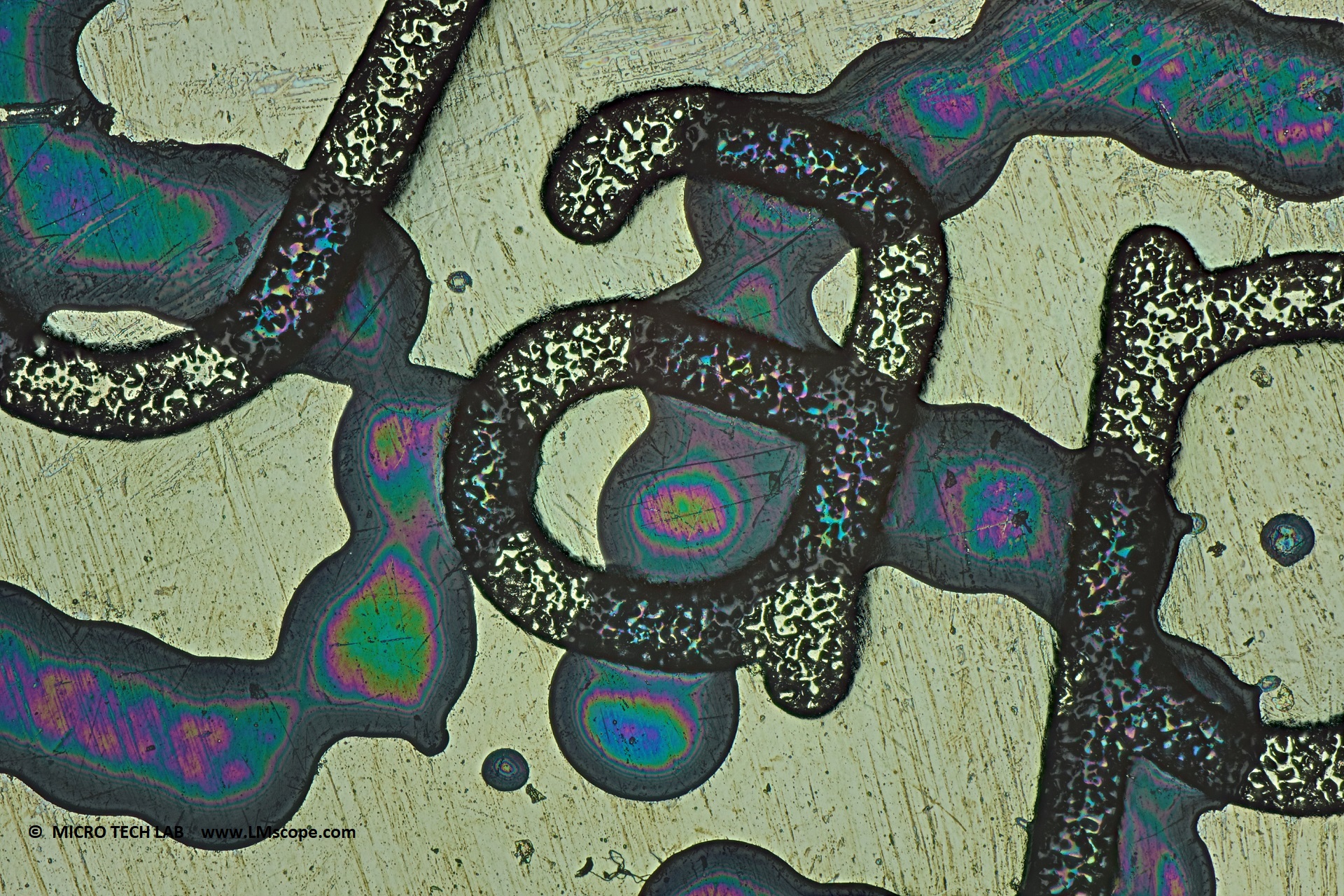 Lithium Knopfzelle: Inspektion und Oberflächenanalyse einer Lithium Knopfzellenbatterie. Darstellung der Oberflächenrauigkeit und Beschriftung. Zeiss-Mikroskop, Auflicht. Kamerasystem: Vollformat Systemkamera Canon EOS R, mit LM Weitfeld Mikroskopadapter