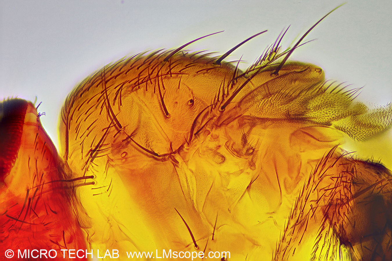 498 Mosca de la fruta (Drosophila) - Detalle cuerpo y AlasMicroscopio,Aumento: 100x ,Fotomicroscopios LM, Canon EOS 5D Mark IV