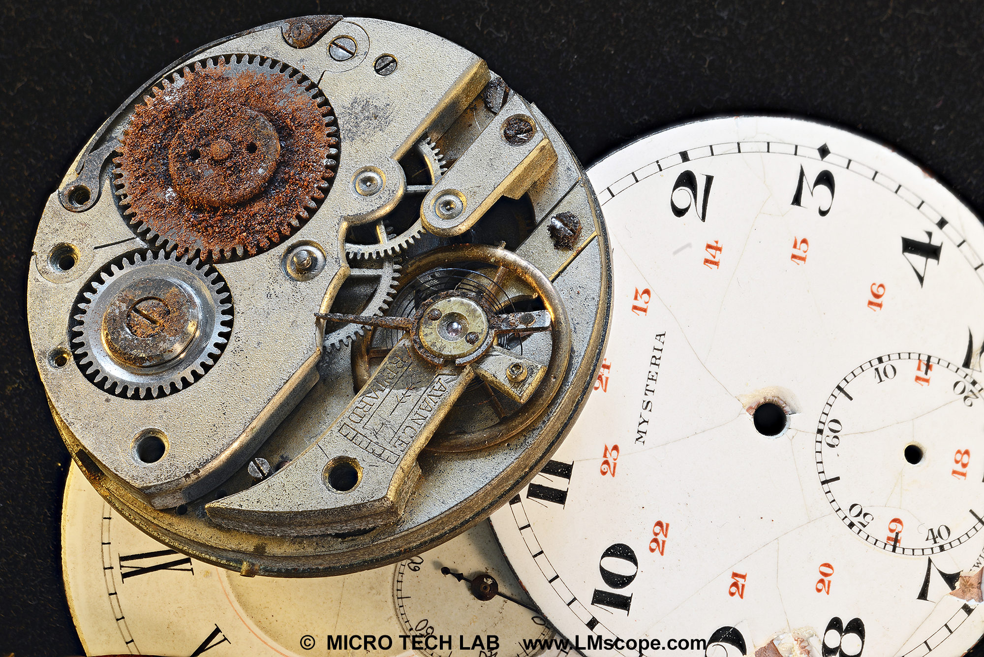 Anciano, mecánico aparato de relojería con orín